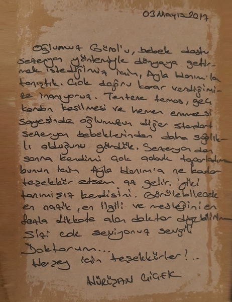 Oğlumuz Gürol'u bebek dostu sezeryan yöntemiyle dünyaya getirmek istediğimiz için Dr Ayla hanımla tanıştık. Çok doğru karar verdiğimize inanıyoruz. Ten tene temas, kordonun geç kesilmesi ve hemen emmesi sayesinde oğlumuzun diğer standart sezeryan bebeklerinden daha sağlıklı olduğunu gördük. Sezeryan sonrası kendimi çok çabuk toparladım, bunun için Ayla hanıma ne kadar teşekkür etsem az gelir. İyiki tanımışız kendisini. Görülebilecek en nazik, en ilgili ve mesleğini en fazla dikkate alan doktor diyebilirim. Sizi çok seviyoruz sevgili Doktorum...