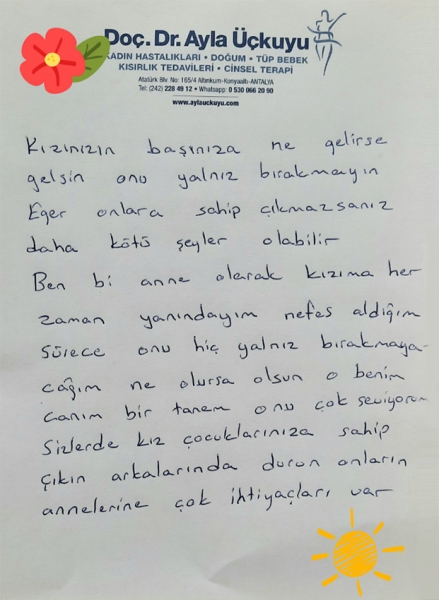 Kızınızın başına ne gelirse gelsin onu yalnız bırakmayın. Eğer onlara sahip çıkmassanız daha kötü şeyler olabilir. Ben bir anne olarak kızımın her zaman yanındayım, nefes aldığım sürece onu hiç yalnız bırakmayacağım. Ne olursa olsun o benim canım, bir tanem, onu çok seviyorum. Sizlerde kız çocuklarınıza sahip çıkın, arkalarında durun onların annelerine çok ihtiyaçları var.