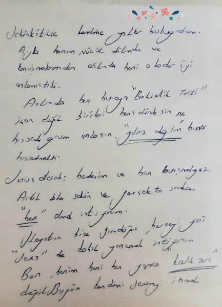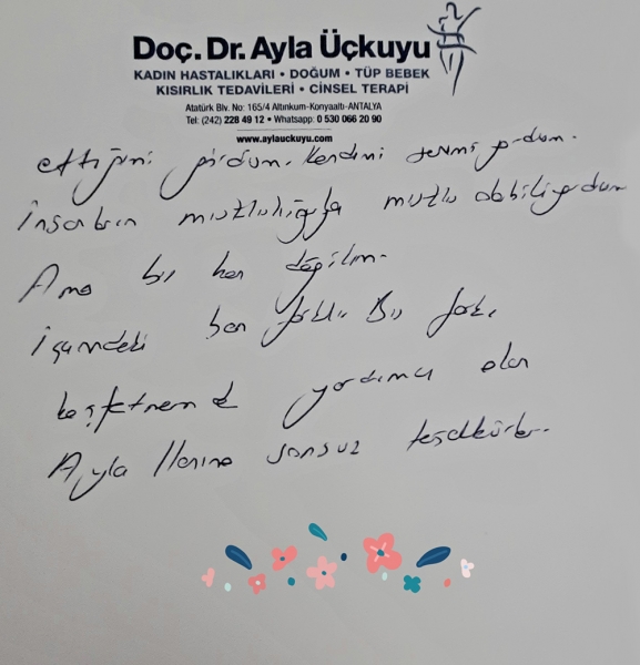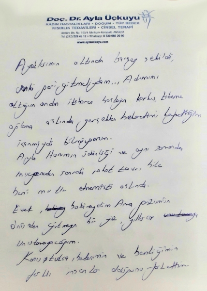 Ayaklarımın altında bir şey çekildi sanki geri gitmeliydim... Adımımı attığım andan itibaren başlayan korku, titreme ağlama aslında gerçekten bekaretimi kaybettiğim için miydi bilmiyorum. Ayla hanımın sakinliği ve aynı zamanda muayeneden sonraki rahat tavrı bile beni mutlu etmemişti aslında. Evet bakireydim, ama gözümün önünden gitmeyen bir yüz, yıllarca unutamayacağım. Konuştukça bedenimin ve benliğimin farklı insanlar olduğunu fark ettim. Sakinleştikçe kendime yollar buluyordum. Ayla Hanım vücut dilimde ve konuşmalarımdan aslında beni o kadar iyi anlamıştı ki.. Aslında ben buraya 'bakirlik testi' için değil birileri beni dinlesin, ne hissediyorum anlasın 'yalnız değilim' bunu hissetmekti. Sonuç olarak; bedenim ve ben barışmalıyız. Artık daha sakin ve gerçekten sadece BEN olmak istiyorum. Hayatın bize sunduğu her şeyi yani 'sexs ' de dahil yaşamak istiyorum. Beni ben yapan kızlık zarı değil. Bugün kendimi sevmeyi ihmal ettiğimi gördüm. Kendimi seviyordum. İnsanların mutluluğu ile mutlu olabiliyordum. Ama bu ben değilim. İçimdeki ben farklı. Bu farkı keşfetmemde yardımcı olan Ayla hanıma sonsuz teşekkürler.....