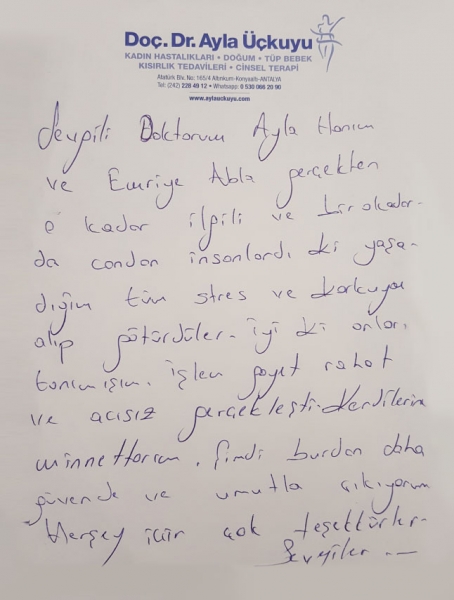 Sevgili Doktorum Ayla hanım ve Emriye abla gerçekten o kadar ilgili ve bir o kadar da candan insanlardı ki yaşadığım tüm stres ve korkuyu alıp götürdüler. İyi ki onları tanımışım. İşlem gayet rahat ve acısız gerçekleşti. Kendilerine minnettarım. Şimdi burdan daha güvende ve umutla çıkıyorum. Her şey için çok teşekkürler... Sevgilerimle