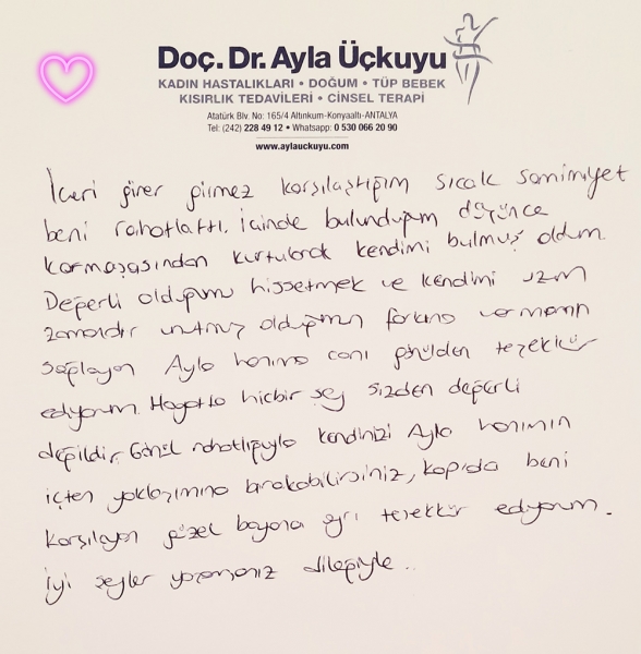 İçeri girer girmez karşılaştığım sıcak samimiyet beni rahatlattı. İçinde bulunduğum düşünce karmaşasından kurtularak kendimi bulmuş oldum. Değerli olduğumu hissetmek ve kendimi uzun zamandır unutmuş olduğumun farkına varmamı sağlayan Ayla Hanıma canı gönülden teşekkür ediyorum. Hayatta hiçbir şey sizden değerli değildir.. Gönül rahatlığıyla kendinizi Ayla hanımın içten yaklaşımına bırakabilirsiniz, kapıda beni karşılayan güzel bayana ayrı teşekkür ediyorum. İyi şeyler yaşamanız dileğiyle ...