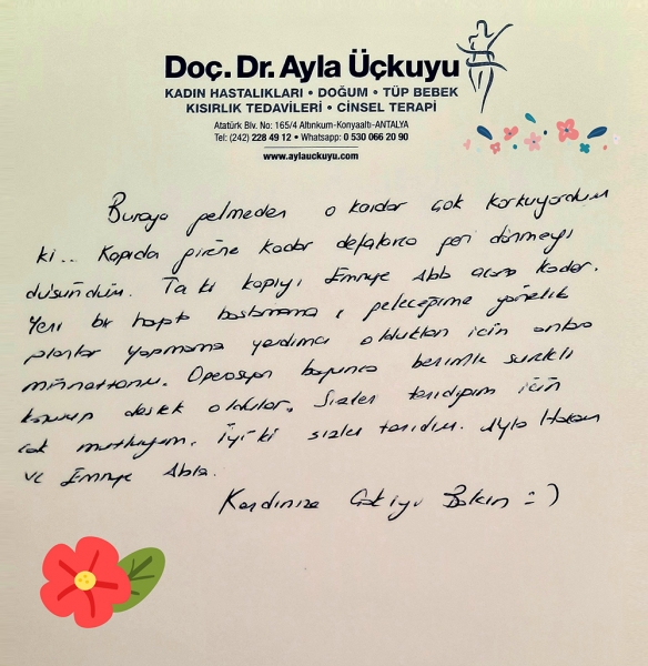 Buraya gelmeden o kadar çok korkuyordum ki.... Kapıdan girene kadar defalarca geri dönmeyi düşündüm. Ta ki kapıyı Emriye Abla açana kadar. Yeni bir hayata başlamama, geleceğime yönelik planlar yapmama yardımcı oldukları için onlara minnettarım. Operasyon boyunca benimle sürekli konuşup destek oldular. Sizleri tanıdığım için çok mutluyum. İyiki sizleri tanıdım. Ayla Hanım ve Emriye Abla