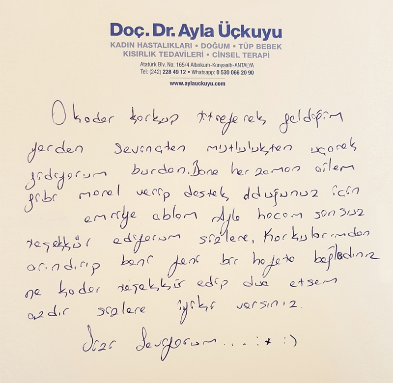O kadar korkup titreyerek geldiğim yerden, sevinçten mutluluktan uçarak gidiyorum burdan. Bana her zaman ailem gibi moral verip destek olduğunuz için Emriye ablam Ayla Hocam sonsuz teşekkür ediyorum sizlere... Korkularımdan arındırıp beni yeni bir hayata bağladınız ne kadar teşekkür edip dua etsem azdır sizlere.. iyi ki varsınız...