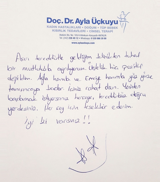 Aşırı teredütlü geldiğim klinikten tuhaf bir mutlulukla ayrılıyorum. Üstelik hiç pozitif degiğldim. Ayla hanım ve Emriye hanımla yüz yüze tanışıncaya kadar. İçiniz rahat olsun. Yeniden başlamak istiyorsanız herşeye, tereddütsüz doğru yerdesiniz. Her şey için teşekkür ederim. İyi ki varsınız !!:)
