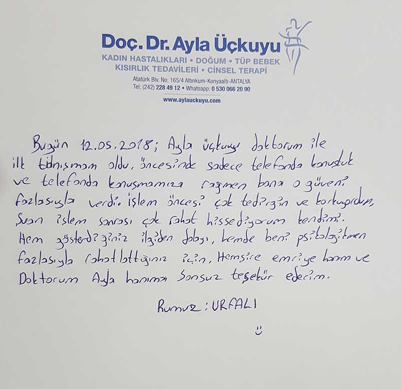 Bugün 12.05.2018; Ayla Üçkuyu doktorum ile ilk tanışmam oldu. Öncesinde sadece telefonda konuştuk ve telefonda konuşmamıza rağmen bana o güveni fazlasıyla verdi. İşlem öncesi çok tedirgin ve korkuyordum. Şu an işlem sonrası çok rahat hissediyorum kendimi. Hem gösterdiğiniz ilgiden dolayı hem de benim psikolojimi fazlasıyla rahatlatlattığınız için hemşire Emriye hanım ve Doktorum Ayla hanıma sonsuz teşekkür ederim.. Rumuz: Urfalı :)