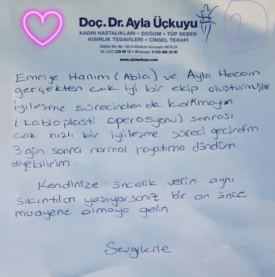 Emriye Hanım (abla) ve Ayla Hocam gerçekten çok iyi bir ekip oluşturmuşlar. Iyileşme sürecinden korkmayın. Labioplasti operasyonu sonrası çok hızlı bir iyileşme süreci geçirdim. 3 gün sonra normal hayatıma döndüm diyebilirim.