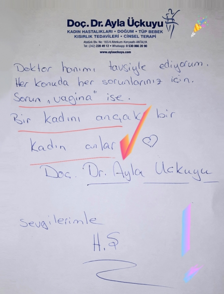 "İlk geldiğimde heyecanlı ve panikliydim. Fakat Doktor hanımın ve Emriye hanımın yaklaşımı beni cok rahatlattı. Korkularım çok yersizmiş. Ameliyat esnasında sohbet etmemiz ayrıca güzeldi. Benim esas sorunumdan ayrı başka bir problemimin olduğunu gören Doktor hanım; onu da kesinlikle yapmam lazım dedi. 'Böyle asla bırakmam!' dedi. Bu benim için büyük bir şanstı. Kendisine minnettarım başka bir doktor olsaydı, sizi ikinci bir operasyonla yapabilirim derdi... İşinin ehli çok güzel bir insan harika bir doktor. Biz kadınları çok iyi anlayan ve kadın sorunlarını bilen bir doktor hanım. Hele ki bir kadının vajina sorunları var ise... Doğumlardan sonra vajinanın bolarması, idrar kaçırması gibi sorunları da olan kadınlar mutlaka gelin! Doktor Hanım'ı tavsiye ediyorum, her konuda her sorunlarınız için..