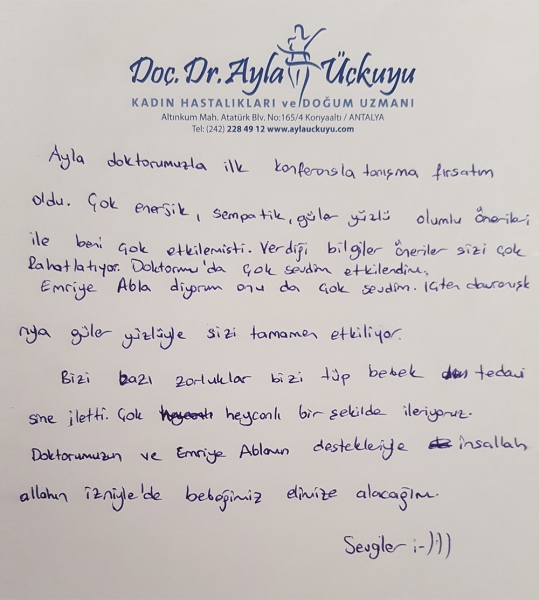 Ayla doktorumuzla ilk konferansta tanışma fırsatım oldu. Çok enerjik, sepmatik güler yüzlü olumlu önerileri ile beni çok etkilemişti Verdiği bilgiler öneriler sizi çok rahatlatıyor. Doktorumuda çok sevdim etkilendim. Emriye abla diyorum onuda çok sevdim. İçten davranışıyla güler yüzüyle sizi tamamen etkiliyor.