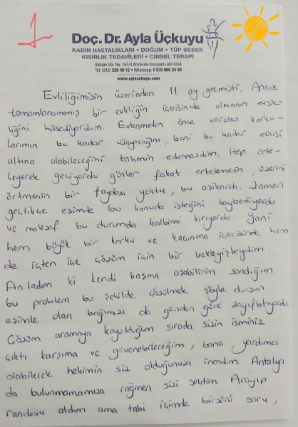 Anladım ki kendi başıma aşabilirim sandığım bu problem bu şekilde çözülmek şöyle dursun, eşimle olan bağımızı da günden güne zayıflatıyordu. Çözüm aramaya koyulduğum sırada sizin isminiz çıktı karşıma ve güvenebileceğim, bana yardımcı olabilecek hekimin siz olduğunuza inandım. Antalya da bulunmamamıza rağmen sizi seçtim. Arayıp randevu aldım ama tabi içim de bir sürü soru, tedirginlik ve endişeyle doluydum. Nasıl bir tedavi olacak, bu problemi birine nasıl açabilirim gibi kaygılarla doluydum. Derken ilk randevuda kendimi ifade etmekte çekimser kaldım. Ancak vazgeçmedim, iyi ki de vazgeçmemişim. Asla kolay bir süreç değildi. Ama kendim içim, eşim ve biz olma yolunda harcadığım bu gayret için huzurlu hissediyordum. Kendimi suçlamak ve eksik hissetmekten yorulmuştum.